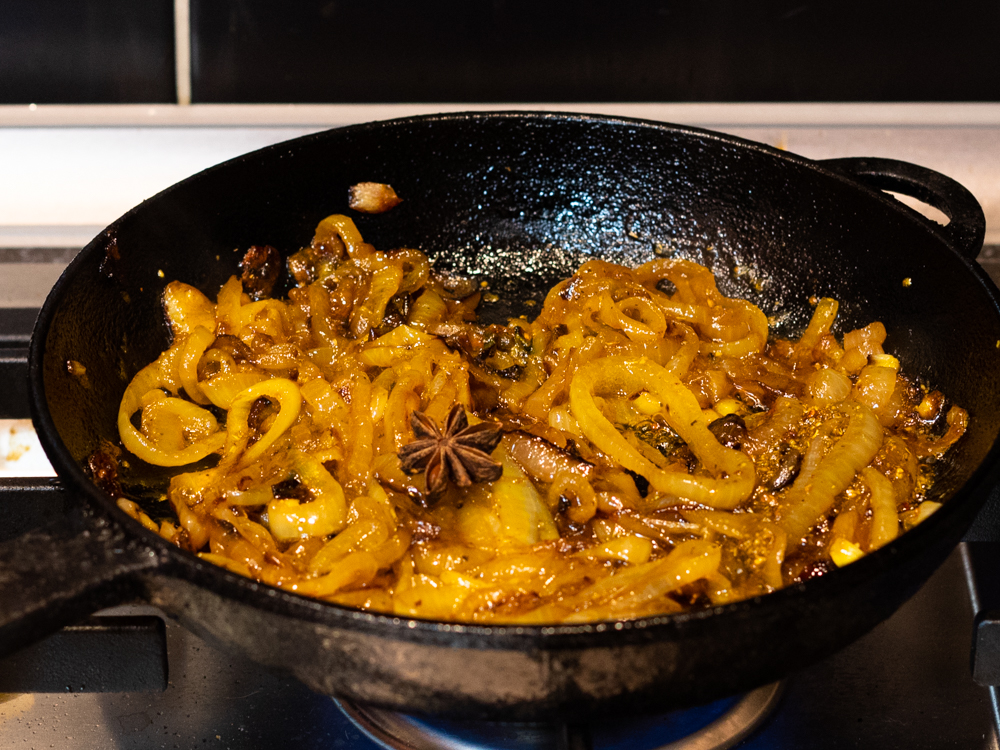 - Add the curry and honey. Stir well. When the onion is dark, pour in the balsamic vinegar. Cook until dark golden brown. At the end, pour in 40 ml of water and let it evaporate. Remove the anise star.