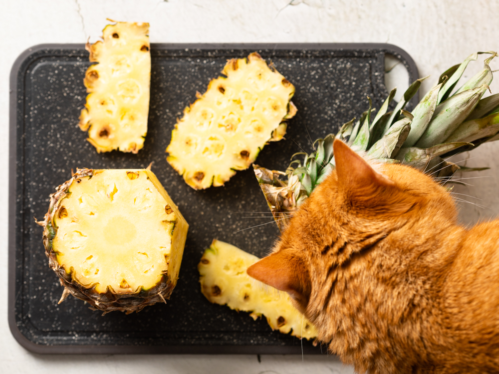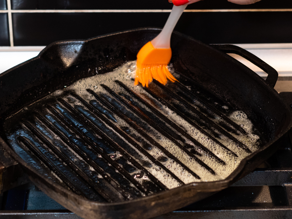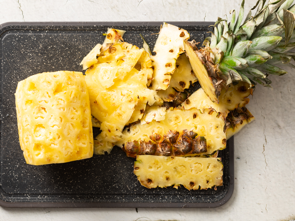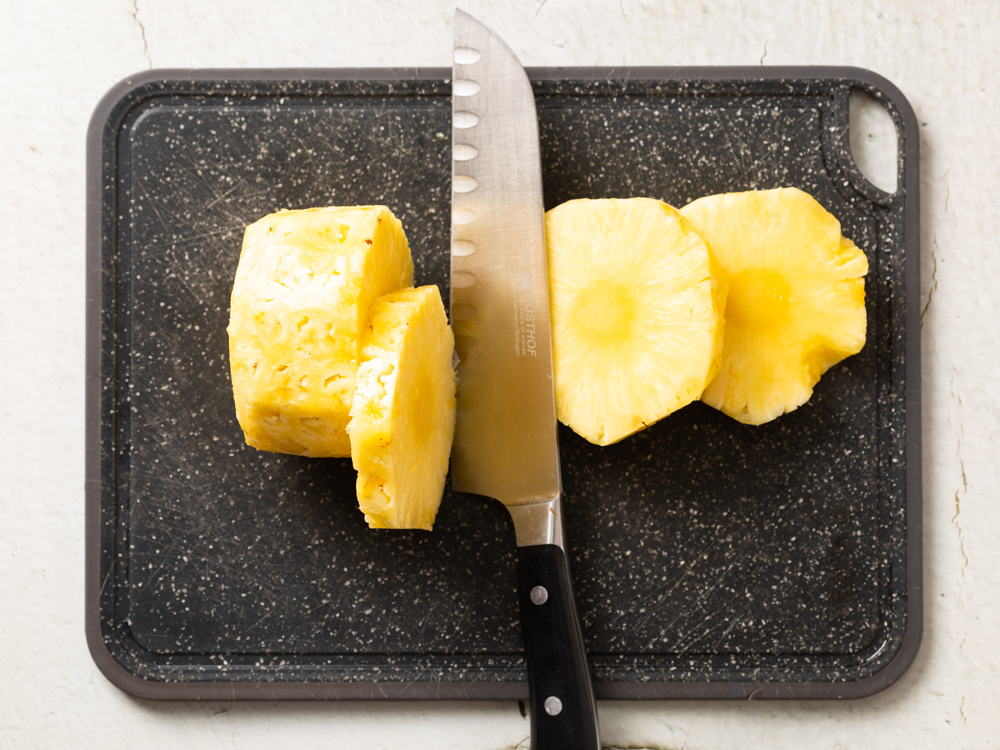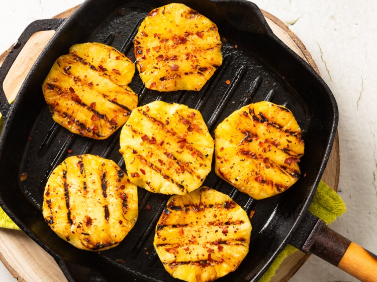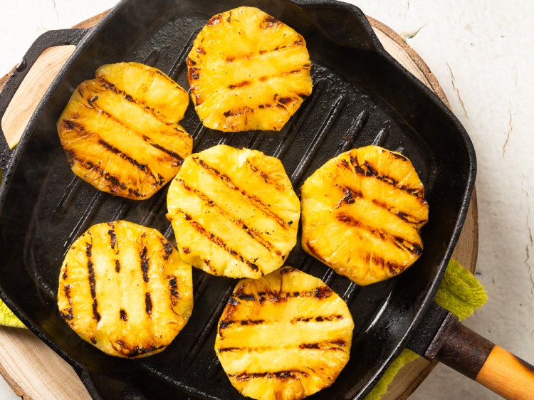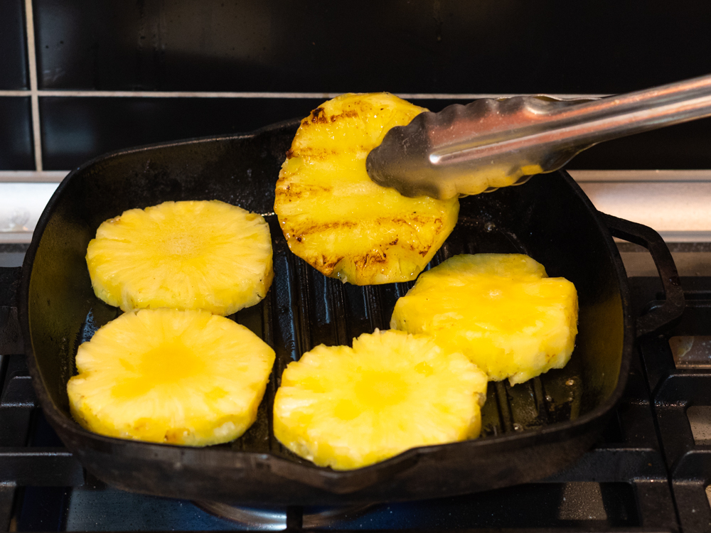 - Brush a grill pan with 1 tbsp of butter. Place the pineapple in the pan and fry over medium heat until dark stripes appear on both sides.