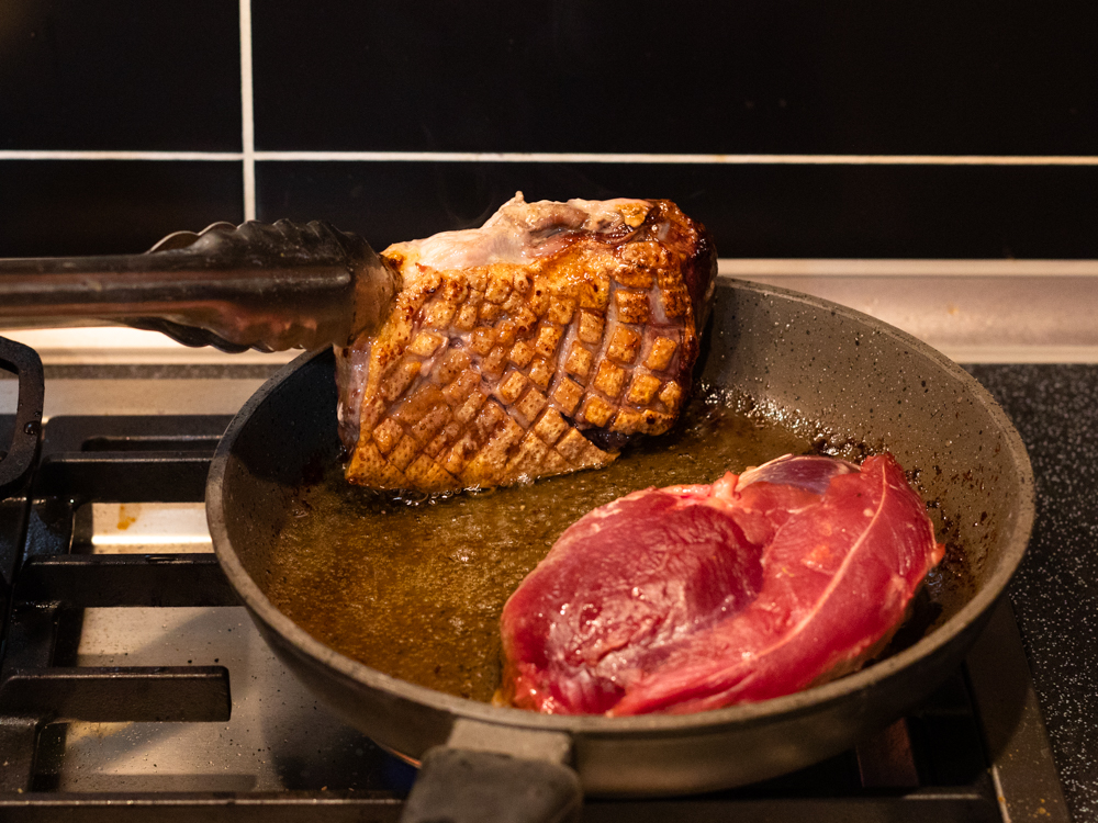 - Cut the skin of the goose fillet, so that you get a mesh. Place the fillets in a dry skillet.