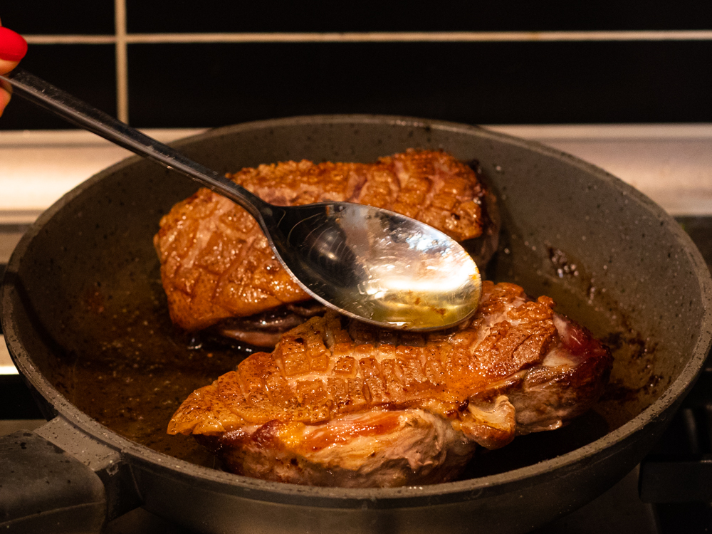 - Cook over low heat until the skin turns golden (it usually takes 15-20 minutes). Turn the fillets over and cook for another 10 minutes. From time to time, drizzle the grease over the goose.