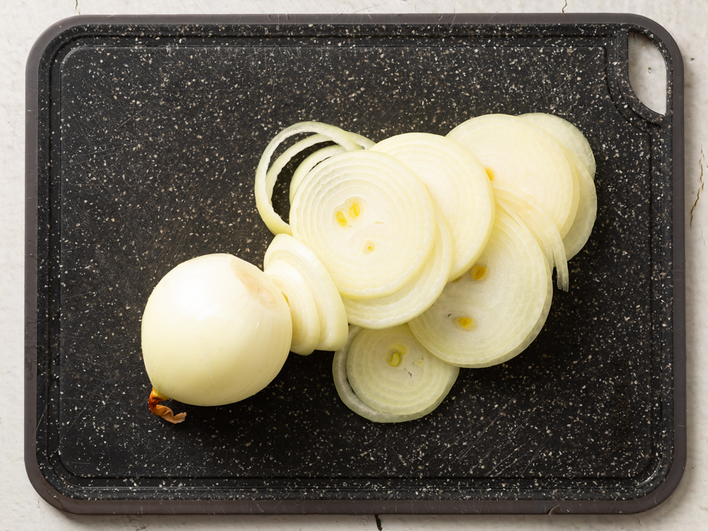 - Cut the onion into rings, but not too thin. Preheat a skillet. Add the 1 tbsp vegetable oil and 1 tbsp butter. Fry the onion until soft, add the anise star.