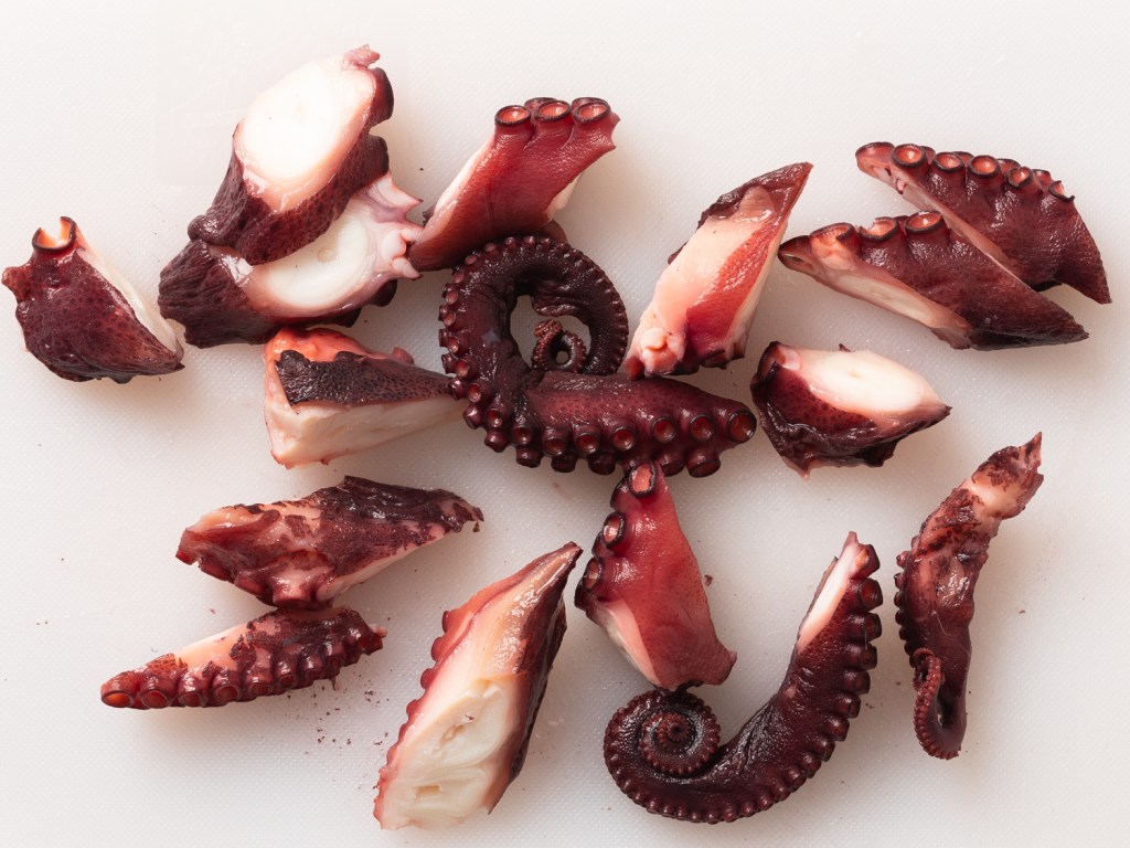 If you have raw octopus, you first need to boil it whole until it’s soft, about 1-2 hours.