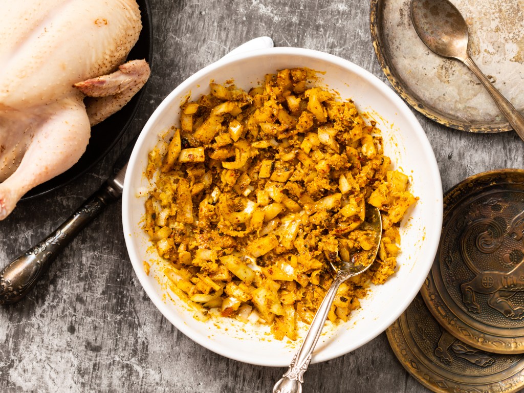 4. Cut the chicken lengthwise into 2 pieces. You need to cut the breast first, then the back on one side of the backbone. Place the chicken in a baking dish and brush both sides with the onion and spice mixture. Place it skin down.