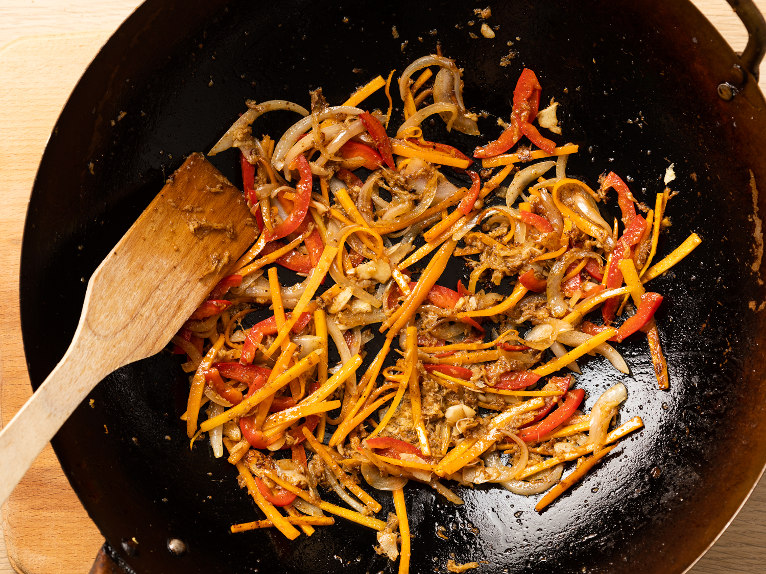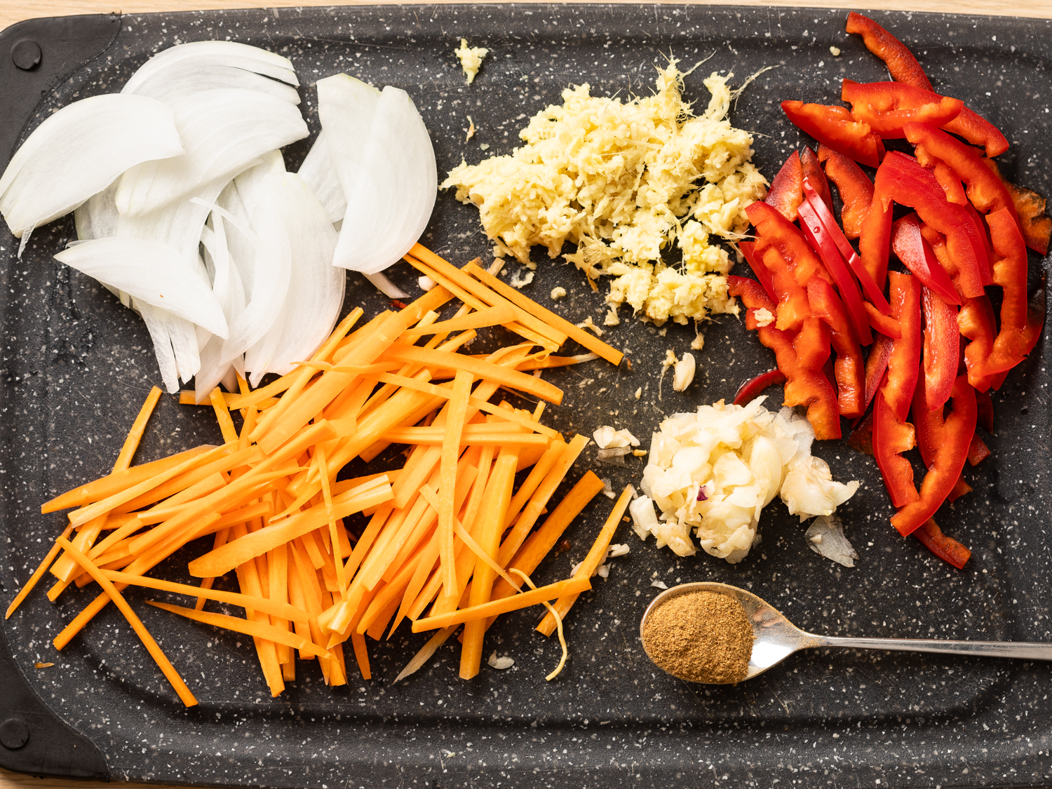- Add the onions and carrots. Fry for about 1 minute. Add bell peppers, garlic, ginger, and five-spice powder to the pan. Fry, stirring constantly for about 2 minutes.