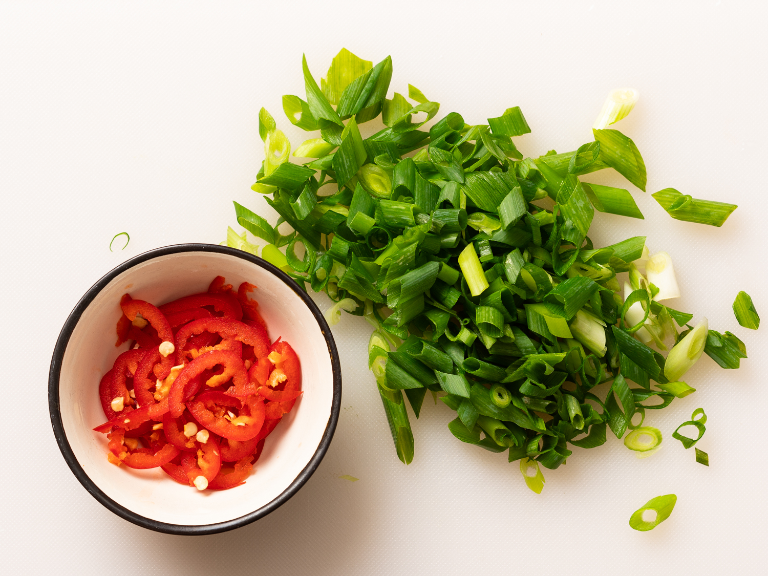 - Peel the peanuts and roast them in a dry pan. Slice the green onions diagonally. Cut the chili in rings.