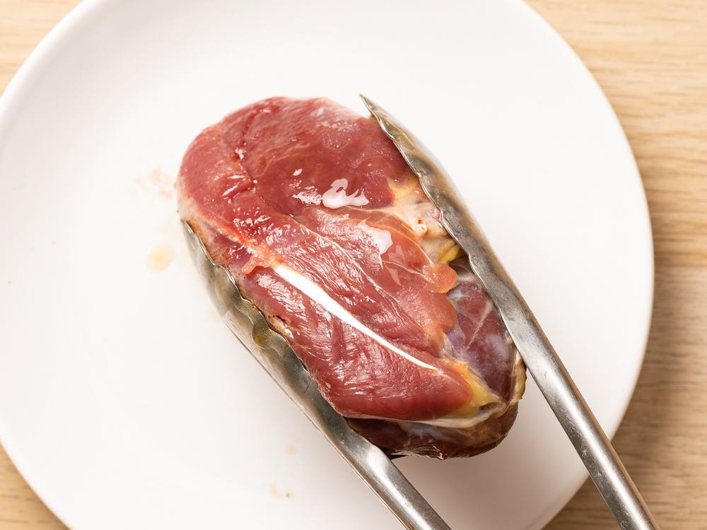 - Dry the duck fillet with paper towels. Rub salt on the skin.
