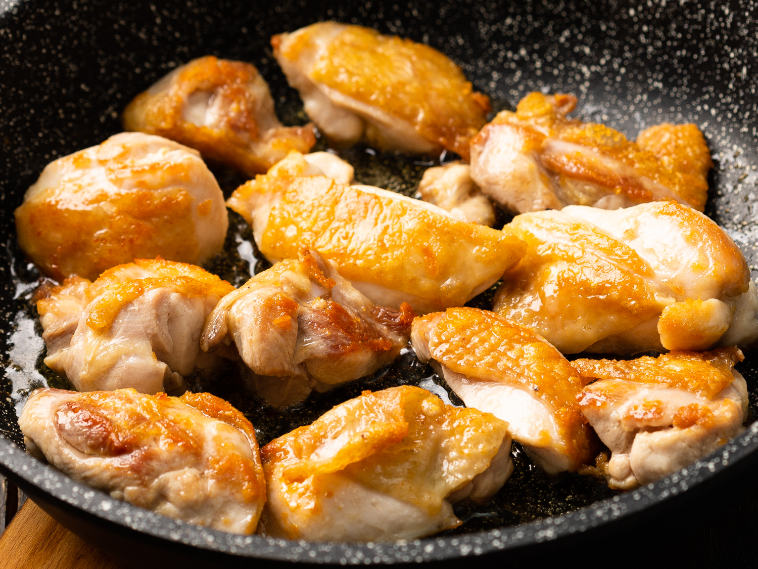 - Heat 3 tablespoons of vegetable oil in a skillet. Fry the chicken until golden on all sides.