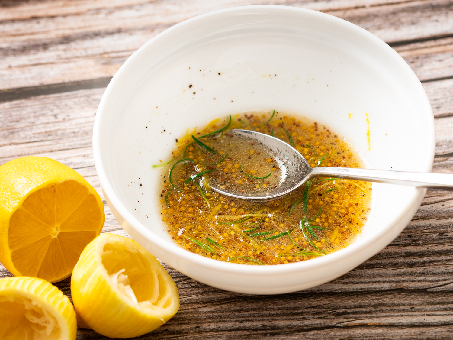 - Remove the zest from a lemon with a special knife or a fine grater. Squeeze out the juice. Mix all the ingredients for the marinade, add rosemary leaves.