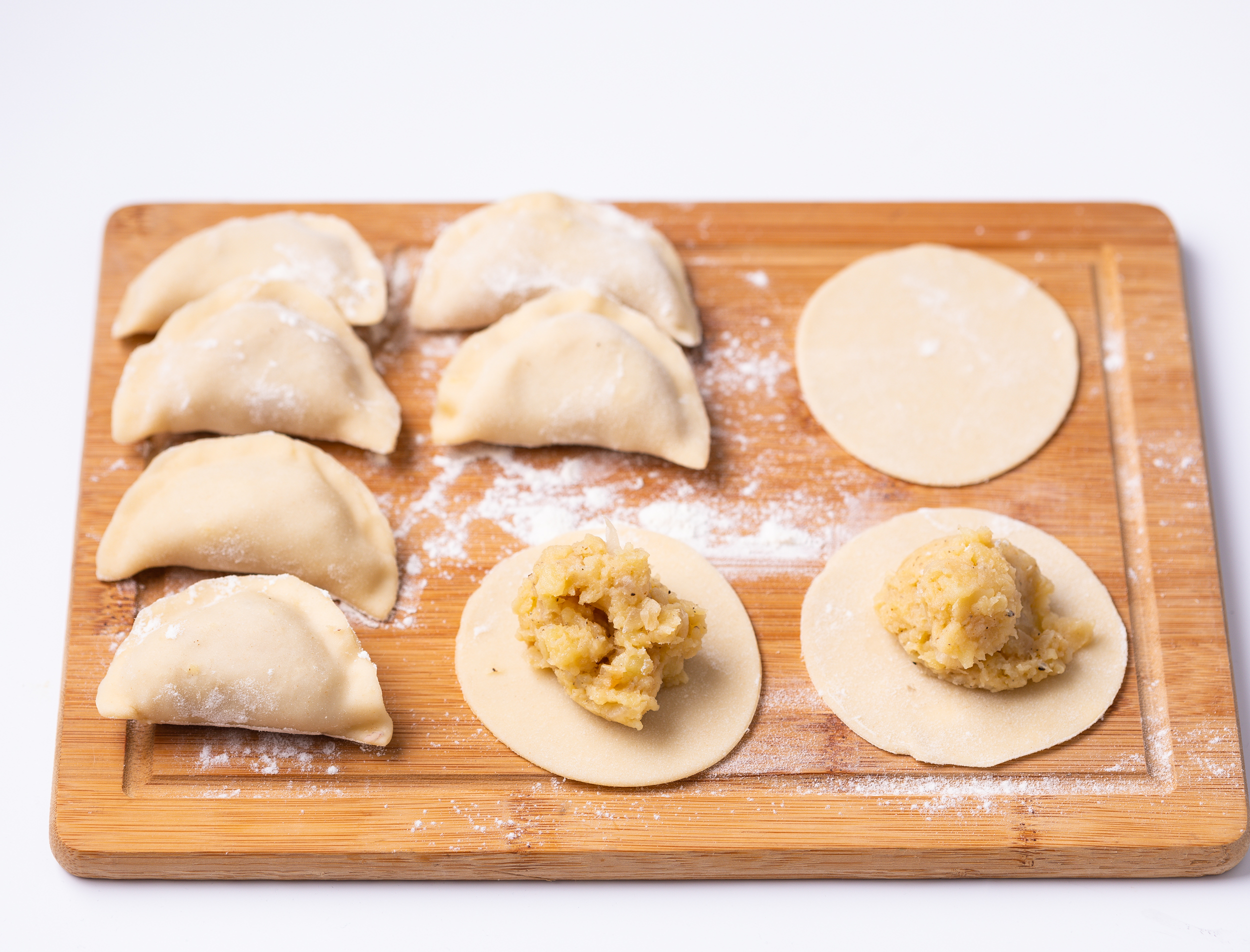 - Fill each circle of dough with 1 tbsp of potato filling. Using a brush, lightly moisten the edges with water and pinch closed.