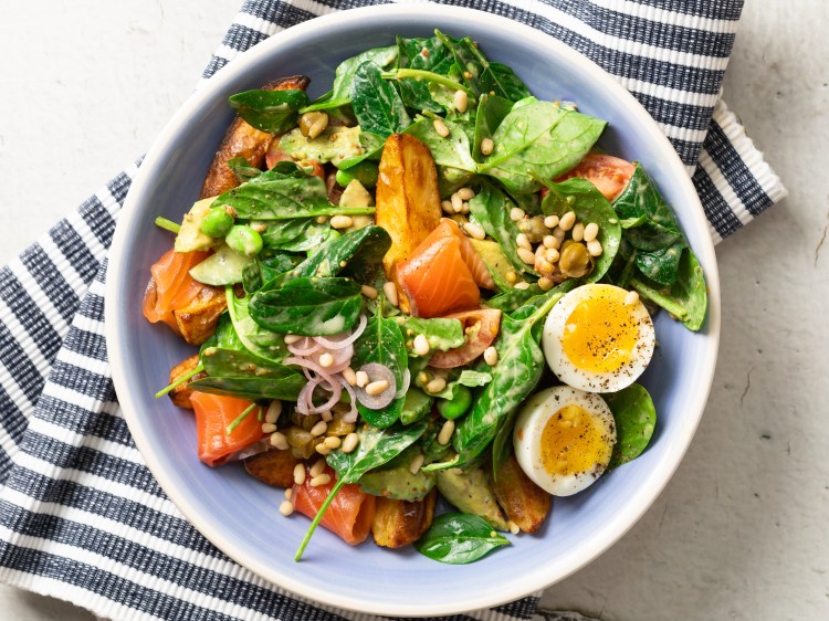 One of my favorite salads. Such a perfect and simple combination of warm potatoes and lightly salted salmon. When there is a season of asparagus, I add it to the salad instead of edamame beans, cucumbers, and avocados. It turns out great!